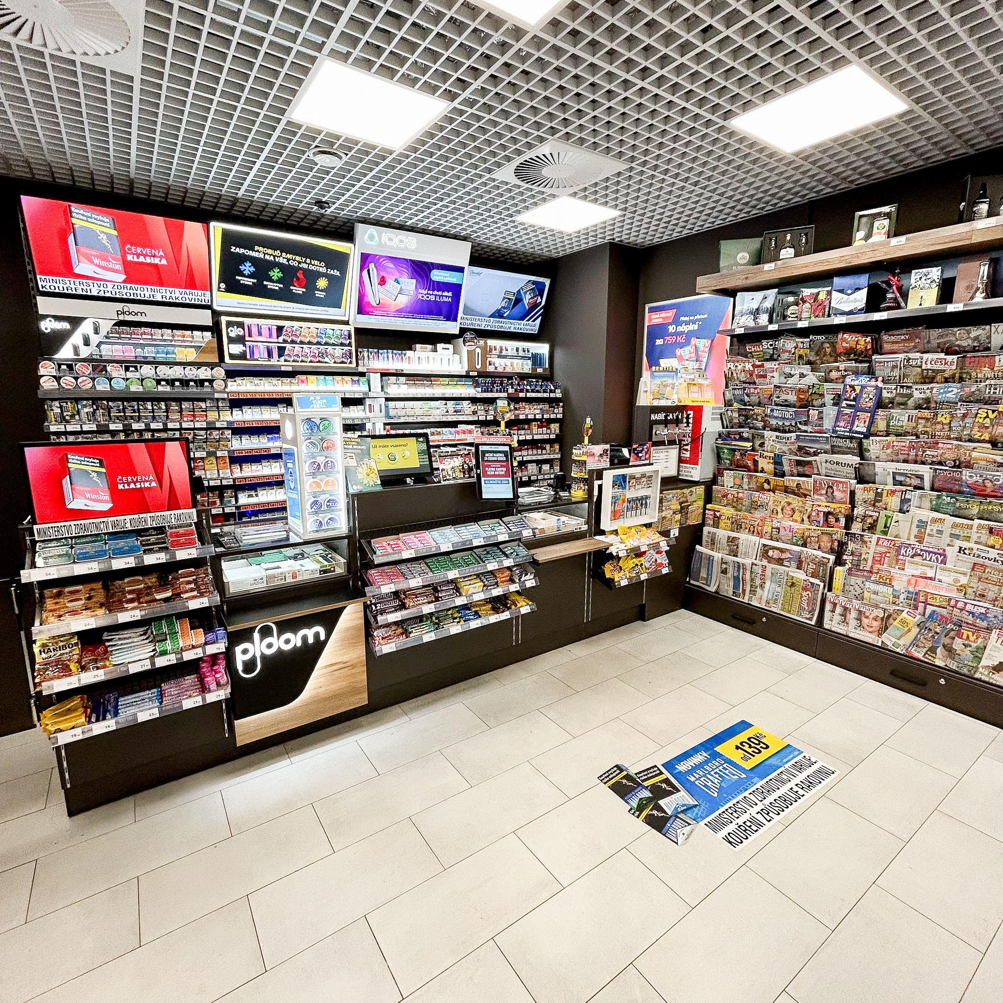 Nabízíme mimo tisku a tabákových výrobků, také luxusní alkohol, zařízení IQOS, náplně do elektronických cigaret, bonboniéry a stáčené víno.